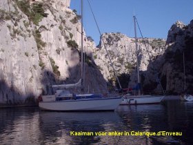 van dit fjord(je) is een kiezelstrand waar we gemakkelijk met de rubberboot kunnen afmeren. De volgende dag 10 juni, voelt al meteen warm aan en gaan we al vroeg een wandeling maken door het ruige landschap rond de calanque en klimmen naar de top van de omliggende bergen, het gebied is zo ontoegankelijk dat we na 1 uur nog steeds niet in de bewoonde wereld zijn, we gaan langs dezelfde weg terug want we zien ons nog niet afdalen van een tamelijk steile berg van zo'n 150 meter hoog. Maar de omgeving is meer dan prachtig en is het een genoegen om door de smalle kloof de weg terug te vinden naar het kiezelstrand. Het gebied is erg populair bij bergbeklimmers, we zien er diverse die met meerderen langs de steile wanden omhoog klimmen. Enerzijds willen we er nog wel een dag blijven anderzijds hebben we gesteld dat wanneer er wind is, we daar dan wel van willen profiteren rond 14.00 uur waait het lekker pittig en halen we het anker op en hijsen de zeilen. Helaas, en dat hebben we al vaker mee gemaakt de afgelopen dagen, de wind houdt geen stand en moeten we na 2 uur de motor starten. We denken een aardige ankerplaaats te vinden bij het eiland Frioul dat voor Marseille ligt, maar dat valt tegen omdat het eiland uitsluitend uit rotsen bestaat en er weinig mogelijkheden zijn om met de hond aan de wal te gaan. Dan nog maar eens 5 mijl verderop langs de kust waar ook kleine calanques op de kaart staan. Maar deze zijn allen omgetoverd tot kleine jachthavens, bij Rouette is een grotere jachthaven en daar meren we om 19.00 uur af. Van de benzinepompbediende krijgen we nog net de code door voor de douches, die overigens heerlijk zijn. Als we de volgende dag en de watertank en de brandstoftank vullen, zijn we klaar voor de laatste mijlen aan de Côte d'Azur. Even overwegen we nog naar Etang de Berre te gaan naar St. Chamas waar bij een wijngaard heerlijke wijn te koop is om daar een voorraadje in te slaan. We hebben de wijngaarden boven op de berg in een prachtige bosachtige omgeving gezien en de wijn smaakt naar de zoete geur van de hars van de pijnappelbomen en de warmte van de hellingen, maar 40 mijl omvaren voor een paar flessen wijn is toch teveel van het goede. Jan fantaseert nog even dat hij zijn collega Niek, hoofd van het bedrijfsbureau en mede verantwoordelijk voor het samenstellen van het kerstpakket en waar hij een kantoor mee deelt, zal bellen en een aanbod te doen om voor een interessante prijs 600 flessen wijn mee te nemen. Als hij zich voorstelt hoe deze gestouwd moeten worden dan blijft er weinig plaats over en we zouden niet met het werk bezig zijn. Dus Niek stel aan Bob (onze baas) voor dat wij samen in het najaar met het busje naar zuid frankrijk gaan om een lekkere fles wijn voor het kerstpakket op te halen.