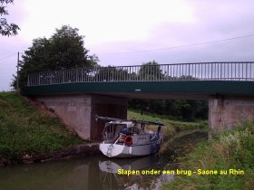 aan het eind van de dag en 75 km verderop vinden we de Seille een zijrivier van de Saone die 40 km. lang is en waarin 3 sluizen zijn opgenomen. Het ziet er allemaal erg verlaten uit en kiezen we ervoor om dicht bij de monding een plaatsje aan een strandje te nemen, als we een wandelingetje maken blijkt er achter het eerste sluisje nog een echte aanlegsteiger in een prachtige, min of meer verstilde, omgeving. Maar we liggen prima en genieten van de rust, 's avonds worden we getrakteerd op een rijke fauna, een witte waadvogel, een Ibis?, een vissende ijsvogel, zwarte wouwen en een otter (echt)paar. Dit allemaal minder dan 50 meter van onze boot met alleen vogelgeluiden en kikkers op de achtergrond. De Saône zal niet lang meer ons deel zijn, we gaan eerst naar de jachthaven van Chalon sur Saone, de supermarkt is dicht bij de haven en kunnen we goed inslaan voor het weekend, daarnaast nog een kaart van de Rhône au Rhin zien te vinden en de site updaten. Voor het eerst sinds lang is het vanochtend bewolkt en krijgen we vermoedelijk ook te maken met de depressie die boven de Noordzee hangt, het is gelukkig nog een aangename 22° en dus niet zo nat en koud als in Nederland. Zondag 20 juni leggen we dan de laatste 80 km af en gaan het kanaal in. Het blijft droog onder dreigende luchten en de wind is frisser, de stilte op deze zondagmorgen is heerlijk we komen nauwelijks iemand tegen, een weldadig gevoel. 's Middags wordt het iets drukker met huurboten en een enkele vakantieganger op weg naar het zuiden. Zo ook de zeilboot Sommerwind, de eigenaren hebben ons gevolgd via de site als voorbereiding op hun eigen reis. Zij komen net de sluis uit en wij varen er in, jammer genoeg gunnen we ons geen tijd om een sluis extra te wachten en ervaringen uit te wisselen. We zijn wat verlaat, José kreeg afgelopen nacht last van de maaltijd die we bij een cafetaria hadden genoten, en was het beter om een paar uur later te vertrekken waardoor ze wat slaap kon inhalen en we wilden ons plan om de dag het Canal Rhône au Rhin te bereiken niet laten passeren. Merkwaardig eigenlijk, we hebben tijd genoeg maar laten ons toch door dit soort plannen bepalen, we bereiken in ieder geval wel het kanaal en nemen daar nog 3 (geautomatiseerde) sluizen. Een slaapplaats voor de nacht is niet direct voor handen en meren we af onder een brug waar het goed liggen is en scheepvaart komt er toch niet meer.